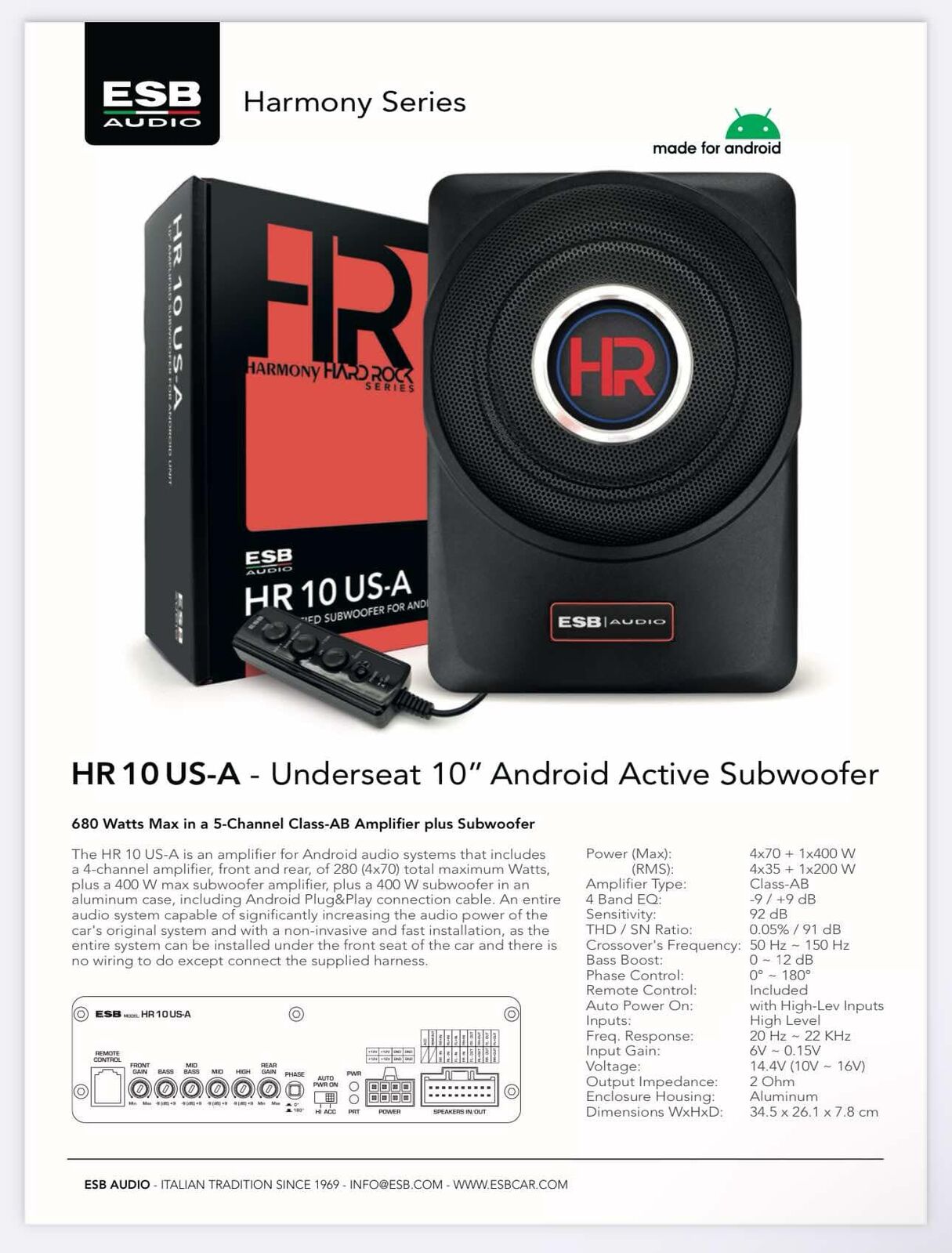 The HR 10 US-A is an Active Subwoofer for Android audio systems that includes a 280 (4×70) W max 4-ch. amplifier, plus a 400 W max amplified subwoofer in an aluminum case, including Android Plug&Play connection cable. An entire audio system capable of significantly increasing the power of the car’s original system.