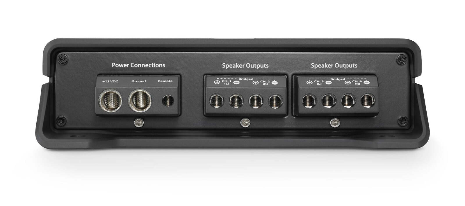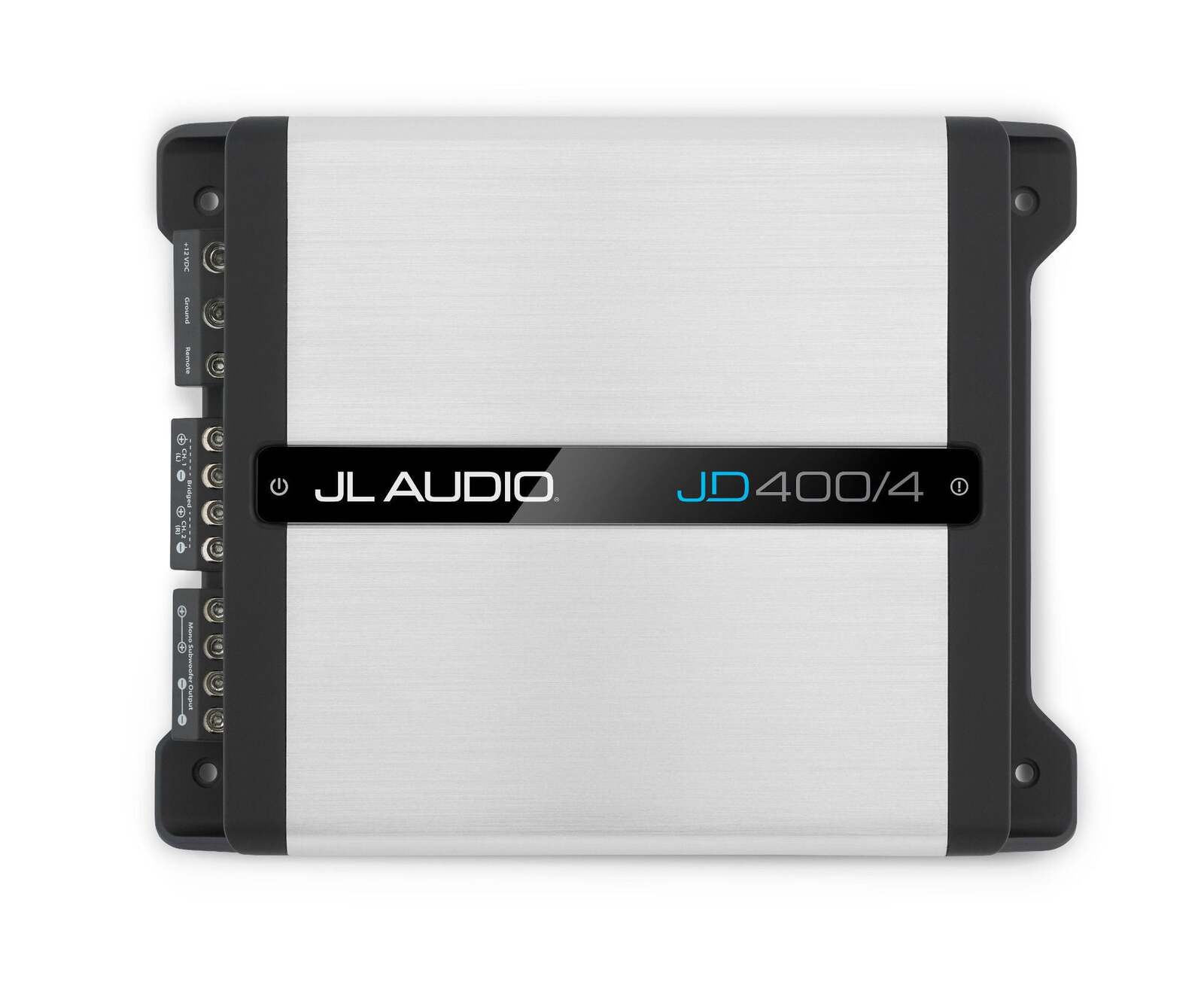 4-Channel Class D Full-Range Amplifier, 100 W x 4 @ 2 ? / 75 W x 4 @ 4 ? – 14.4V Utilizing our exclusive NexD high-speed switching technologies, the JD400/4 amplifier is engineered to deliver loads of clean power, with excellent efficiency and low distortion. This little guy churns out 100 watts of audio from each of its four channels into 2 ohms (14.4V, 1% THD) and is fully bridgeable, so it can be used as a 3-channel amplifier, or as a 2-channel amplifier producing a whopping 200W x 2 into 4 ohms. The JD400/4s controls can be found on the input panel of the amplifier, with all speaker and power connections located along the opposite end of the extruded aluminum chassis. Signal processing features include high or low-pass 12 dB / octave filters (defeatable) for each channel pair, with continuously variable frequency selection from 50-500 Hz, and dual-range, differential-balanced inputs capable of accepting line-level or speaker-level signals. Automatic turn-on capability (via signal sensing or DC-offset sensing) is standard equipment. Onboard LED-clipping indicators are also included surrounding each input sensitivity control. This convenient feature lets you set your amplifiers input sensitivity, quickly and accurately, without special equipment. You will also find a set of buffered, pass-through preamp outputs on-board, so you can pass signals to another amplifier.