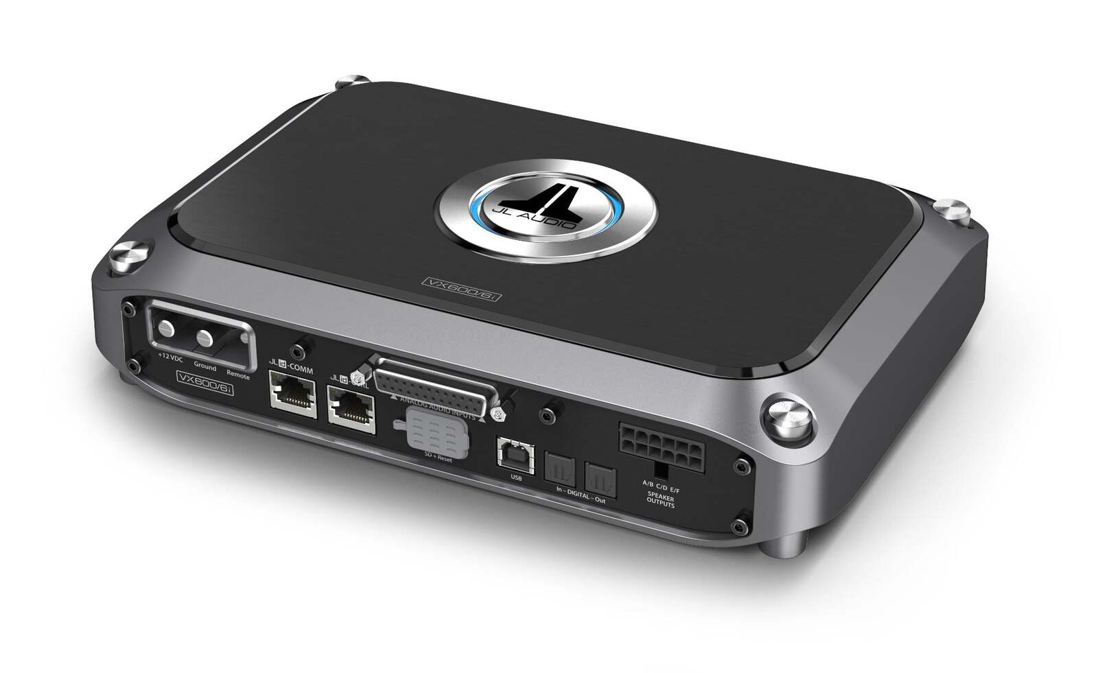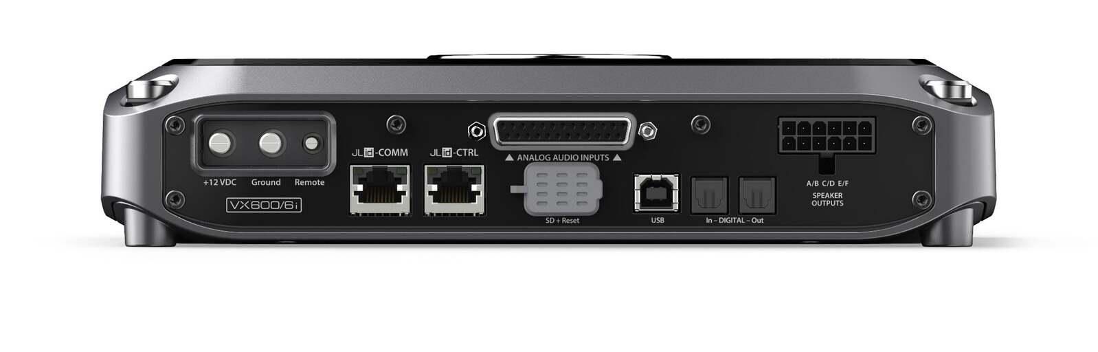 6-Channel Class D Full-Range Amplifier with Integrated DSP, 100 W x 6 @ 2 ? / 75 W x 6 @ 4 ? – 14.4V Designed to simplify great audio, every VXi amplifier combines our advanced NexD2 switching amplifier technology with an integrated, full-featured digital signal processor. With our second-generation NexD2 technology, the VX600/6i full-range amplifier outputs up to 75 watts per channel into 4 ohms, or 100 watts into 2 ohms. It can also be bridged into 4 ohms, producing up a rock-solid 200 W x 3. The NexD2 full-range technology in this amplifier is DSP-controlled and features a reduced loop area design utilizing DirectFET outputs for outstanding fidelity, very low noise and exceptional efficiency. The amplifier chassis is ultra-compact, with all connections on one side, to greatly simplify installation into tight spaces. Instead of traditional control knobs and switches, all amplifier adjustments and DSP functionality are configured via a compatible external device (PC, Tablet or Smartphone), with the appropriate JL Audio TüN® Software application installed. Amplifier includes: Power Connector (for 4 AWG wire), Analog Input/Pre-Out Harness, Speaker Output Harness, 6 ft A/B USB Cable Features: Unprecedented, Onboard DSP Tuning Power! Powerful DSP permits optimizing each channels timing, frequency response and output levels, for exceptional sound quality. TüN Software delivers fast and easy setup, at your fingertips. Make all adjustments with a clear interface. Free TüN software is available for computers and most handheld devices. 2nd-Gen NexD2 Switching Amplifier Technology Advanced, high-speed switching technology delivers reference-grade power and efficiency. DSP-synchronized power supply and output channels produce world-class sound quality with very low noise and distortion. Ultra-Versatile Analog and Digital Inputs/Outputs Differential-Balanced Analog Inputs accept speaker level signals up to 16V RMS, including those from factory systems. Delivers outstanding noise rejection to prevent alternator whine and other noises. Optical Digital (Toslink) Inputs permit direct connection of S/PDIF digital sources, bypassing A/D converter. Accepts up to 24 bit/192 kHz input. Analog and Digital Pre-Outs (pass-through or fully configurable): RCA Pre-Outs (4V RMS Max) and Optical (Toslink) Output at 24 bit/96 kHz Automatic turn-on options via signal-sensing or DC-offset sensing JLid System Command and Control with Networking Capabilities Proprietary JL Audio protocol provides control interface and all communication for VXi amplifiers and optional JLid accessories, including: DRC-100 / DRC-205 (Digital Remote Controllers): Offers convenient DSP preset selection and level adjustments from the drivers seat. VXi-BTC Bluetooth® Communicator: Adds wireless connectivity for amplifier configuration from a compatible iOS® or Android® device. VXi-HUB Optical Network Hub: Provides network connectivity for up to six VXi amplifiers, allowing full-system DRC control and preset selection. Up to two VXi-HUBs can be daisy-chained to control up to ten VXi amplifiers.