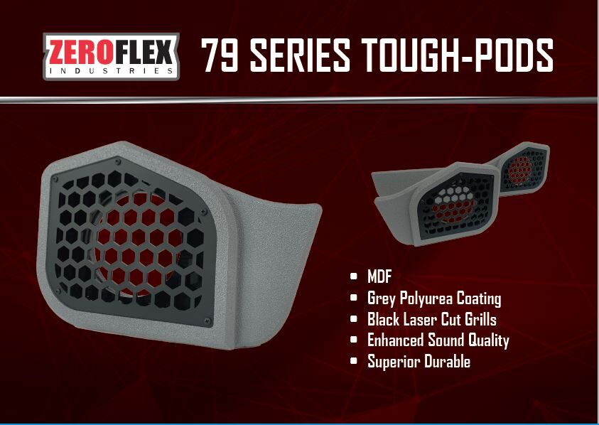 The Zeroflex 79 Series Tough Door Pods are designed to deliver superior sound performance while withstanding the toughest conditions. Crafted from durable MDF and featuring sleek black laser-cut grills, these pods are built for both style and strength. The advanced grey polyurea coating ensures extra protection against the elements, making them perfect for outdoor and off-road applications. With enhanced sound quality and a rugged, long-lasting design, the Zeroflex 79 Tough pods are the ideal choice for audiophiles seeking both performance and durability in their vehicle audio setup.