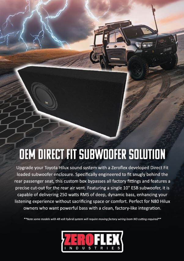 Upgrade your Toyota Hilux sound system with a Zeroflex developed Direct Fit loaded subwoofer enclosure. Specifically engineered to fit snugly behind the rear passenger seat, this custom box bypasses all factory fittings and features a precise cut-out for the rear air vent. Featuring a single 10″ ESB subwoofer, it is capable of delivering 250 watts RMS of deep, dynamic bass, enhancing your listening experience without sacrificing space or comfort. Perfect for N80 Hilux owners who want powerful bass with a clean, factory-like integration.