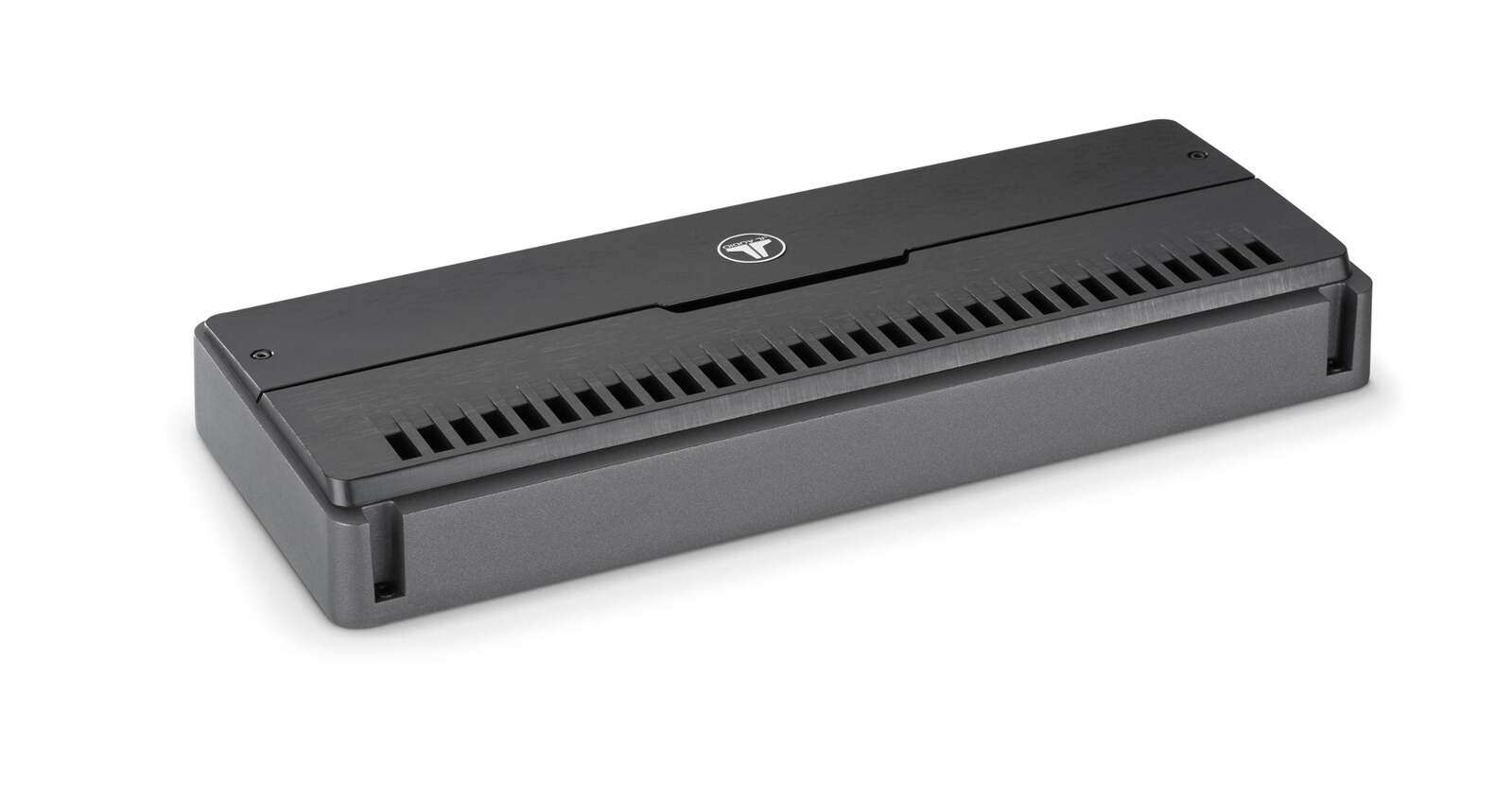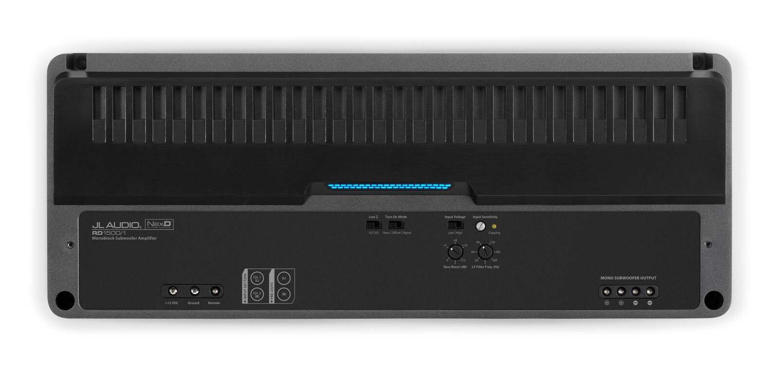 Monoblock Class D Subwoofer Amplifier, 1500 W x 1 @ 1 – 2 ? / 750 W x 1 @ 4 ? – 14.4V Engineered for high-power, subwoofer applications, the RD1500/1 monoblock amplifier is built to deliver staggering amounts of world-class bass output. Equipped with a special low impedance circuit, the RD1500/1 is capable of generating a whopping 1500 watts of output power, at either 1 or 2 ohms (14.4V, 1% THD). At the heart of this ultra-sleek and compact power plant is JL Audios exclusive NexD Class D technology, permitting high power output with exceptional efficiency and low distortion. For your convenience, all of the RD1500/1s controls are located on top of the amplifier, beneath a protective cover, with all connections found along one side of its chassis. Signal processing features include a 12 dB / octave low-pass filter, with continuously variable frequency selection from 50-500 Hz, and a variable bass boost EQ. Dual-range, differential-balance inputs are also onboard, capable of accepting most input voltage levels. Automatic turn-on capability (via signal sensing or DC-offset sensing) is standard, along with a set of preamp outputs so you can easily pass signals to another amplifier. The RD1500/1 is also equipped with an onboard LED-clipping indicator. This all-new, innovative feature lets you easily set your amplifiers input sensitivity setting, quickly and accurately, with no special equipment needed. The RD1500/1 features a durable, black powder-coated finish and a top-mounted, dual-color LED light strip that reports the overall status and condition. Control of the subwoofer level from the drivers seat is easily accomplished with the addition of the optional RBC-1 remote level control (sold separately).